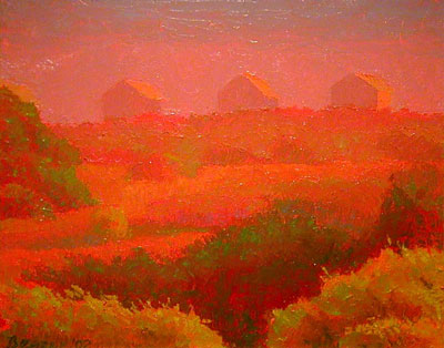 Henry Hensche told Ms. Benzer in 1980 that "An Impressionist (plein-air) painting done well will tell you the time of day and time of year, weather and even where it was painted as light effects change dramatically in different areas of the world." The "plein-air" style of painting attains this unique visionary truth of light and color through a simple but painstaking process of blocking the colors in and mixing and comparing and remixing repeated right on the canvas until the truth of the light effect is glowing on the canvas as it glows in Nature.